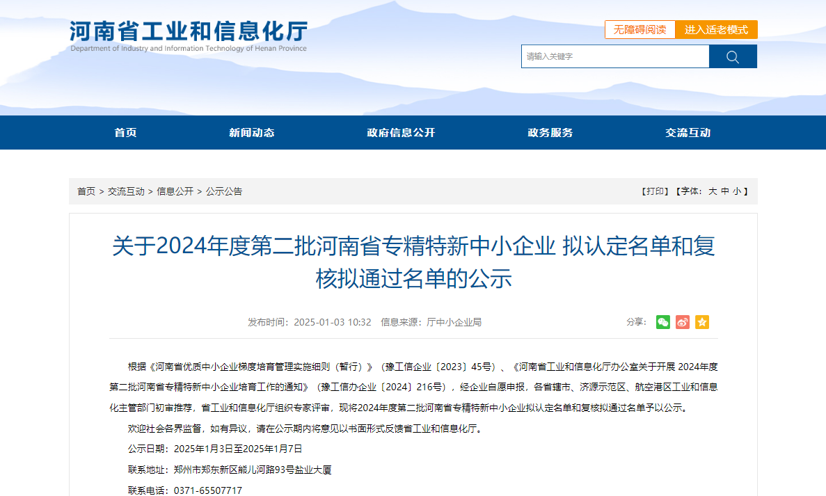 根据《河南省优质中小企业梯度培育管理实施细则(暂行)》(豫工信企业〔2023〕45号)、《河南省工业和信息化厅办公室关于开展 2024年度第二批河南省专精特新中小企业培育工作的通知》(豫工信办企业〔2024〕216号),经企业自愿申报,各省辖市、济源示范区、航空港区工业和信息化主管部门初审推荐,省工业和信息化厅组织专家评审,现将2024年度第二批河南省专精特新中小企业拟认定名单和复核拟通过名单予以公示。